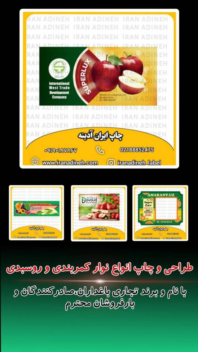 چاپ ایران آدینه در تهران با ارائه خدمات تخصصی در زمینه چاپ لیبل میوه اختصاصی، طراحی لوگو، چاپ سبدی، و بستهبندی محصولات کشاورزی، به شما کمک میکند تا محصولات خود را بهصورت حرفهای و جذاب به بازار عرضه کنید. ما با بهرهگیری از بهترین تکنولوژیهای چاپ و تیم طراحی مجرب، انواع لیبلهای انگشتی، برچسب، لیبلهای صدفی، متالایز و کاغذی را تولید کرده و بر روی محصولات شما نصب میکنیم.
