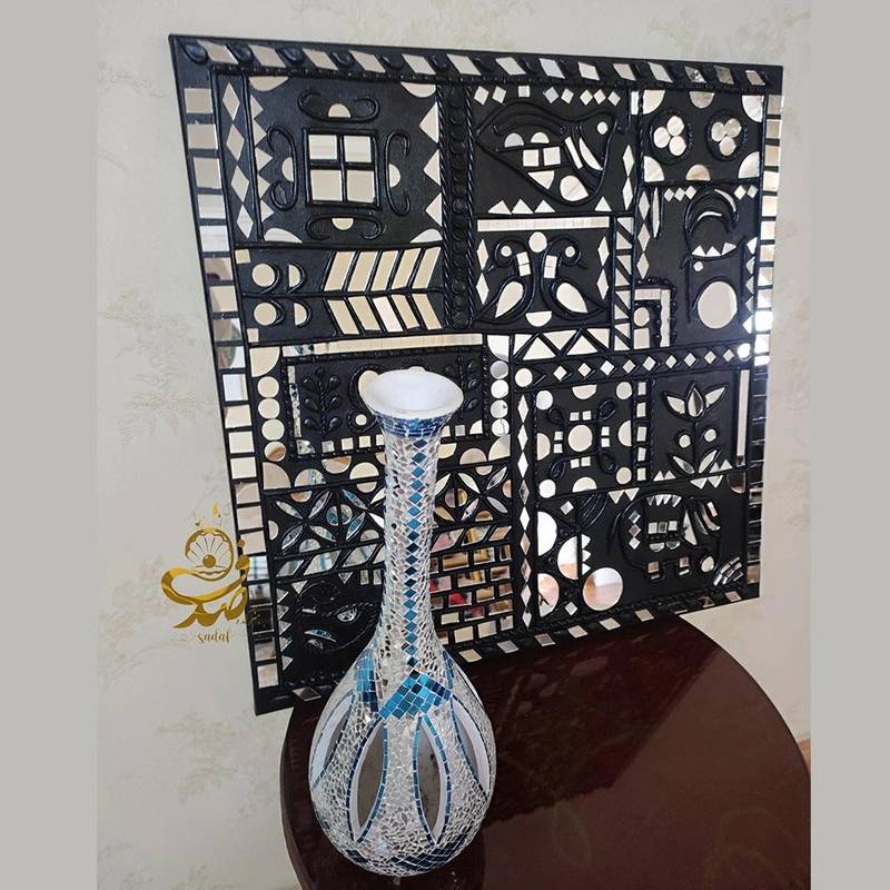 تابلو لیپان با رنگ مشکی، کار شده با خمیر دستساز و اینه های سنتی، اجرا شده روی بوم