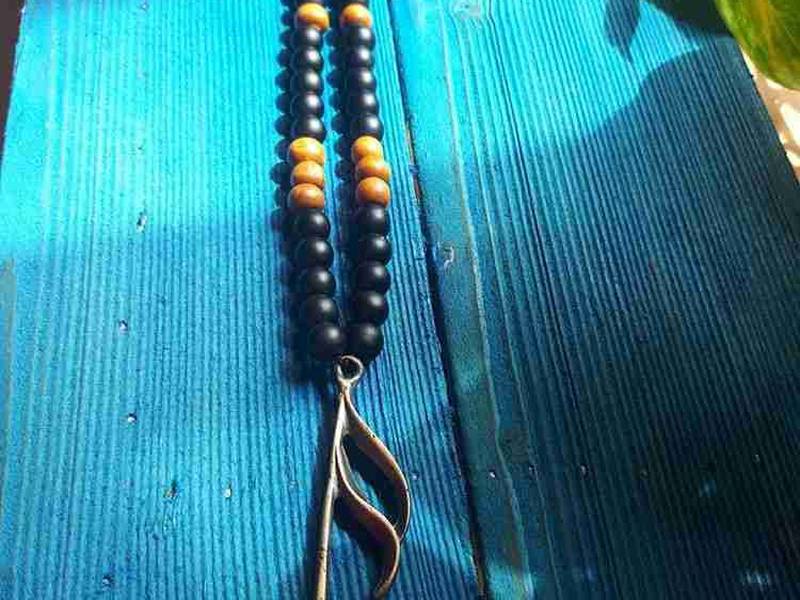 گردنبندی زیبا ساخته شده با سنگ های تراشیده شده به همراه پلاک های جذاب از جمله موسیقی برای علاقه مندان به کارهای هنری