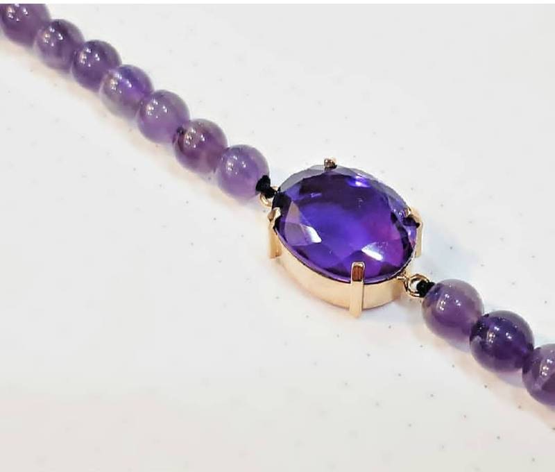 سنگ طبیعی آمتیست با رنگ بنفش عمیق و جذاب خود در مرکز این اثر قرار گرفته است. این سنگ نماد آرامش درونی، تقویت خلاقیت و ایجاد تعادل روحی شناخته میشود و به دستبند جلوهای معنوی و خاص میبخشد.