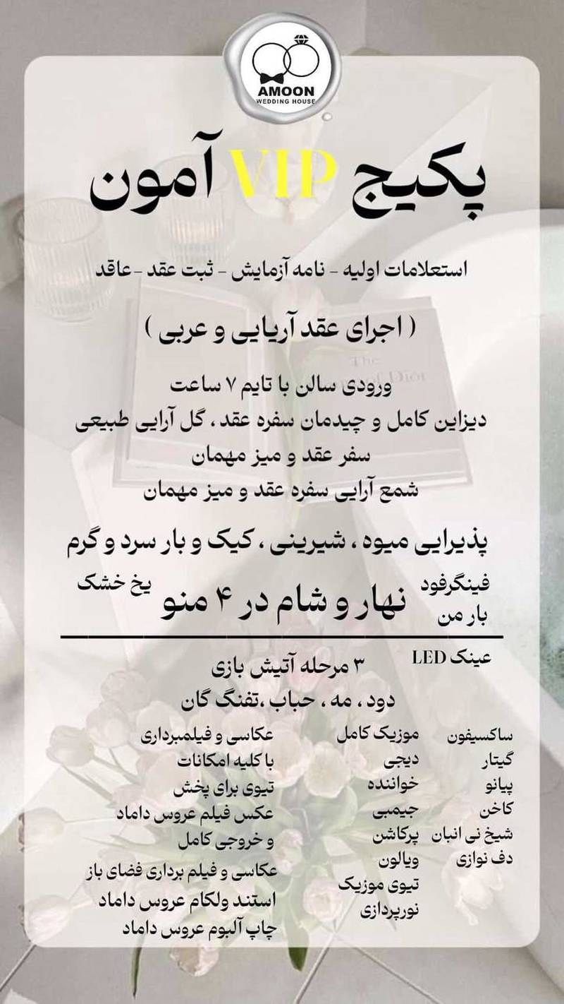 سالن آمون با طراحی داخلی زیبا و چیدمان منحصر به فرد، آماده میزبانی از لحظات ناب و به یاد ماندنی شماست. دسترسی آسان به پارکینگ اختصاصی و آسانسور، رفاه و آسودگی خاطر مهمانان گرامی را تضمین میکند. همچنین وجود دفتر ازدواج در داخل مجموعه، مراحل اداری ثبت رسمی عقد را بسیار ساده و روان میسازد.