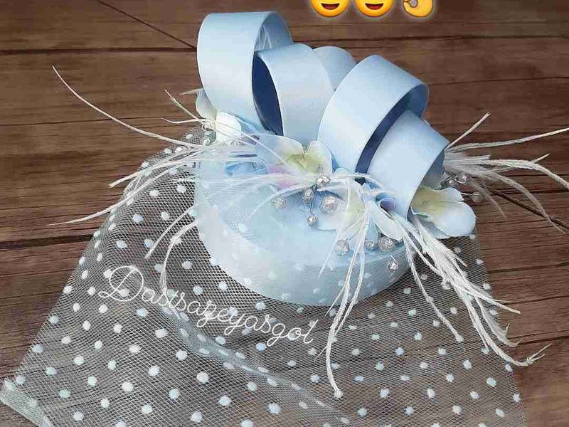 کلاه فرانسوی ابی ملیح با روکش ساتن امریکایی مات و گل های شمعدانی ابی و دیزاین کریستال و پر