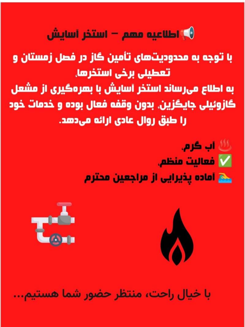 به اطلاع میرساند استخر آسایش با بهره گیری از مشعل گازوئیلی جایگزین، بدون وقفه فعال بوده و خدمات خود را طبق روال عادی ارائه میدهد.