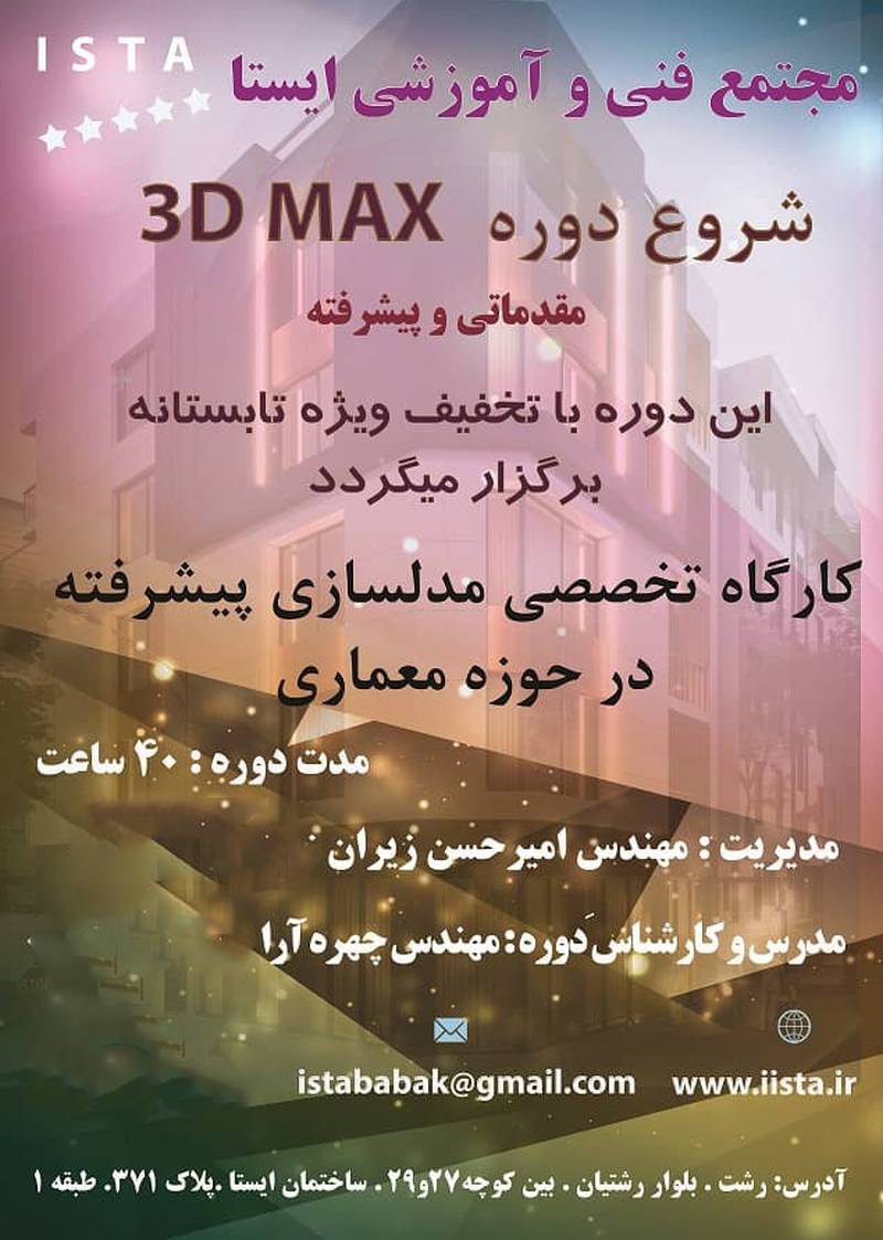 مجتمع فنی و آموزشی ایستا (ISTA) با سابقه درخشان در حوزه آموزشهای تخصصی، دورههای جامع 3D MAX مقدماتی و پیشرفته را با تخفیف ویژه تابستانه برگزار میکند. این دورهها بهصورت عملی و پروژهمحور طراحی شدهاند تا هنرجویان را برای ورود به بازار کار آماده کنند.