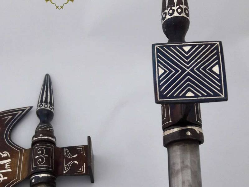 🔹️تبرزین نقره کوب 🔹️ارتفاع ۷۰ سانتی متر 🔹️جنس اصلی کار فولاد که بسیار محکم و مقاوم هست 🔹️جنس روی کار نقره خالص میباشد که باعث ارامش میشود 🔹️یه کار بسیار انتیک برای دکور خونه ، محل کار ، علامت های مذهبی و ... 🔹️تماما کار دست 🔹️هم بصورت نقره کوب و هم بصورت ساده قابل ارائه هست