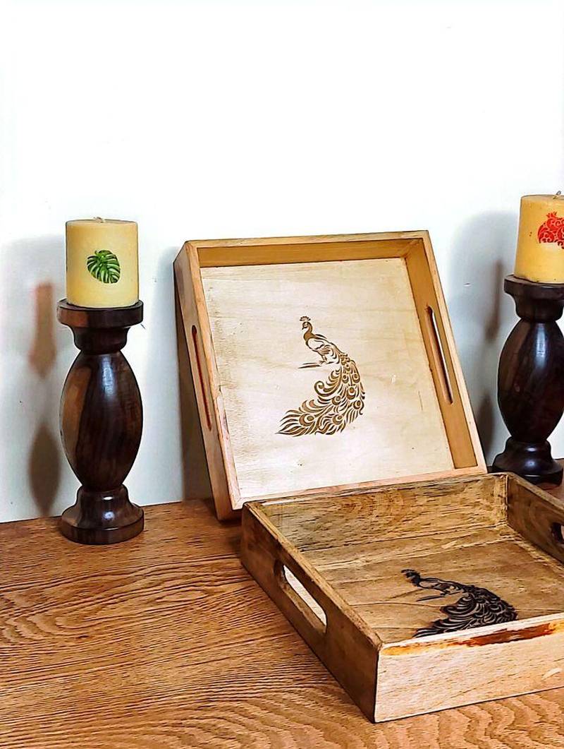 خرید سینی مربع چوبی طرح طاووس در گرگان
