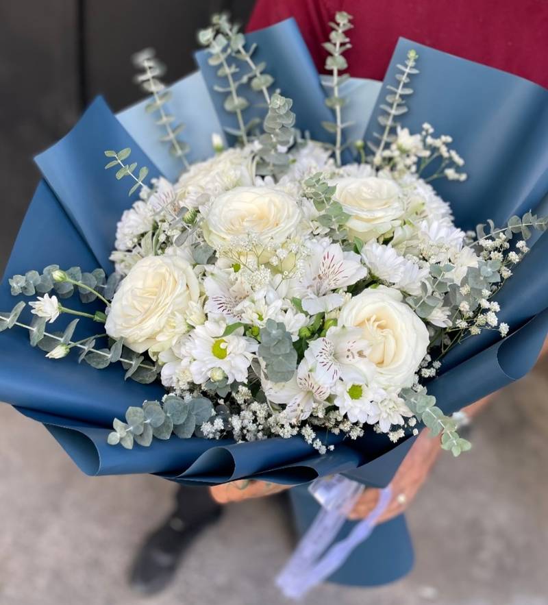 یک دسته گل زیبا و شیک که با هنرمندی و دقت از ترکیب گلهای طبیعی و باکیفیت تهیه شده است. این ترکیب منحصر به فرد شامل رزهای ظریف و خوشبو، السترهای پرپشت و چشمگیر، داوودیهای پرجلوه و باوقار، شاخههای ابری و ظریف ژیپسوفیلا و برگهای گرافیکی و مدرن اوکالیپتوس است.