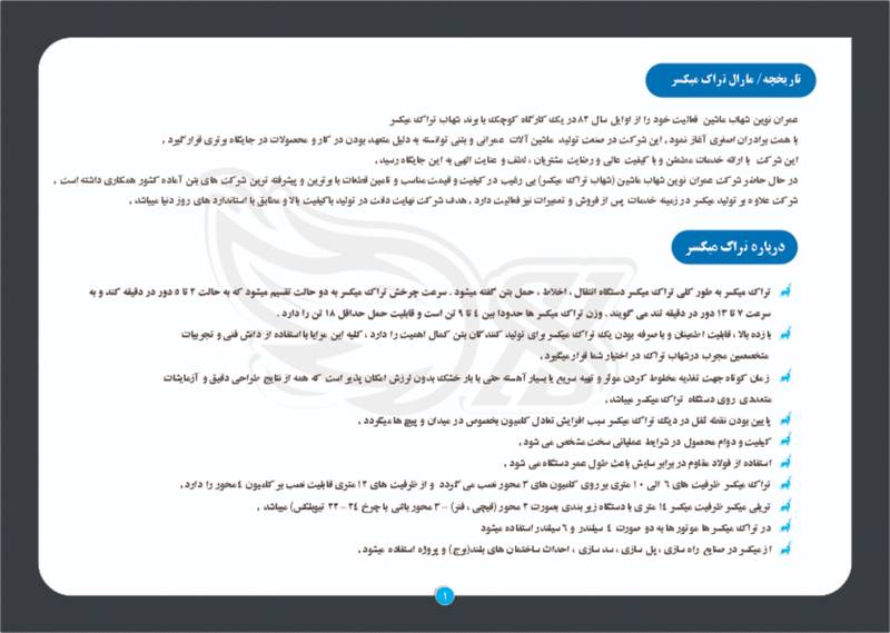 اولین وکامل ترین تولیده کننده در شمال غرب کشوربا چندین سال سابقه کار فعالیت در زمینه تولید تراک میکسر 6 الی 14 متر مکعب، فروش و تعمیرات تراک میکسر و آهنگری مکانیکی در تبریز
