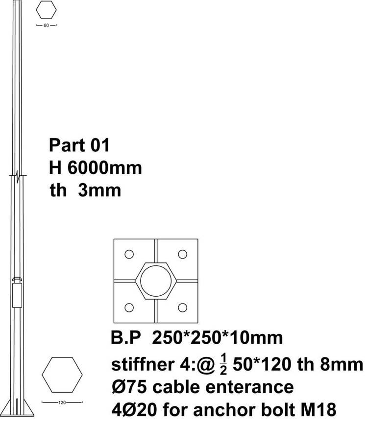 پایه روشنایی 6 متری گالوانیزه شش وجهی گرید B