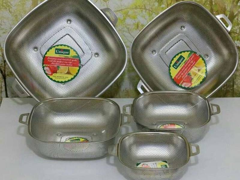 تولید شده از استیل مرغوب نگیر 5 عدد آبکش مربعی با 5 سایز مختلف با کیفیت و مقاومت بالا در برابر ضربه همراه با دستههای استیل متناسب با بدنه داری پایههای کوچک تعبیه شده در کف آبکش مناسب برای شستشو و آبکشی سبزیجات، برنج، میوه و …