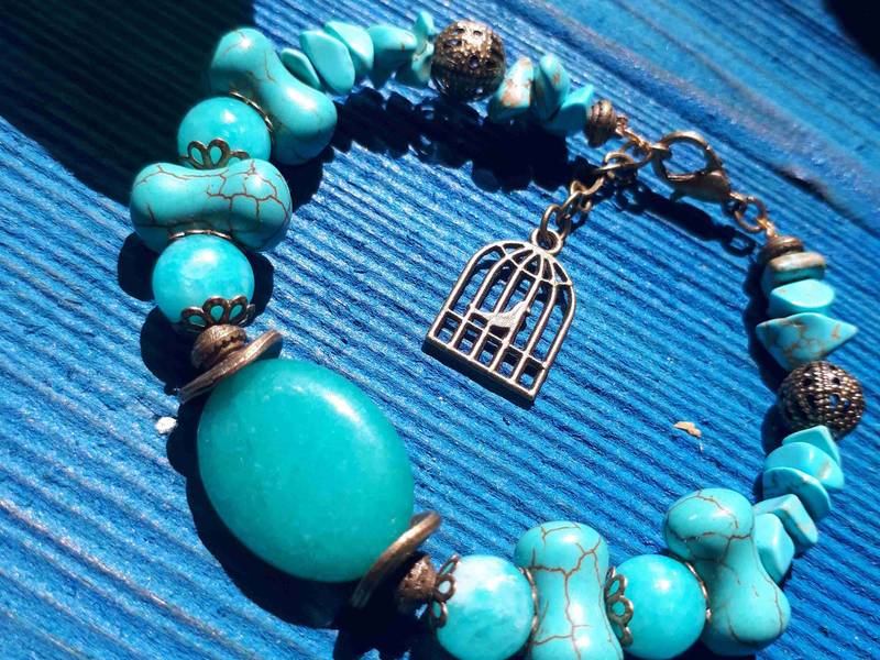 دستبند فیروزه ای من :شامل سنگ های اصل وبین کارهای برنزی استفاده شده