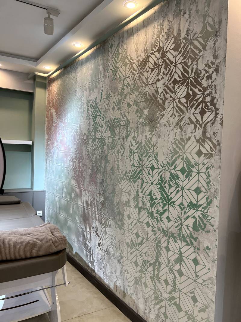 همانطور که می دانید هنر زیبای پتینه کاری از تکنیکهای مختلفی تشکیل شده است. یکی از مدلهای پتینه کاری، پتینه برجسته آن است که بافتی زیبا را به سطوح میدهد. طرح مقابل نمونه ی پتینه ی برجسته با استفاده از متریال میکروسمنت میباشد . در این طرح از چند رنگ مختلف و بافت و شابلون های مختلف که تناسب و هارمونی با فضای سالن آرایشی داشته استفاده شده است . در زمان اجرا میتوان بافت سه بعدی به اجرا بخشید . در حال حاضر از پتینه برجسته برای تغییر دکوراسیون در بسیاری از ساختمانهای لوکس و زیبا استفاده می شود.