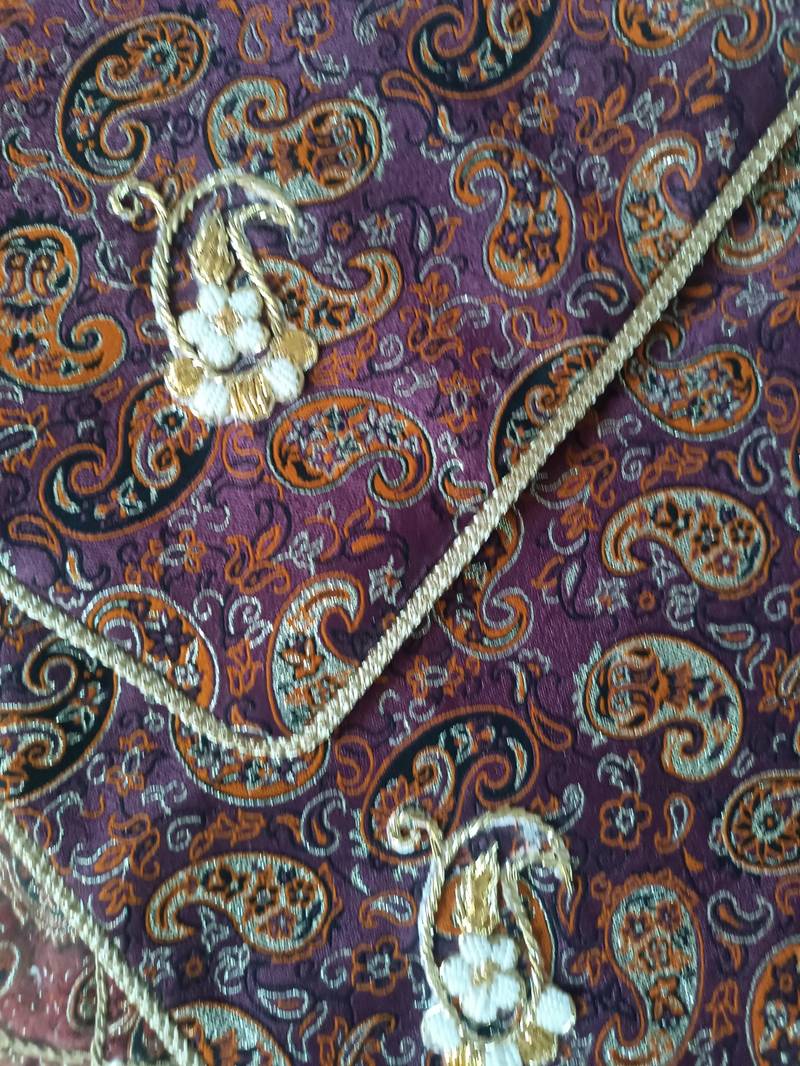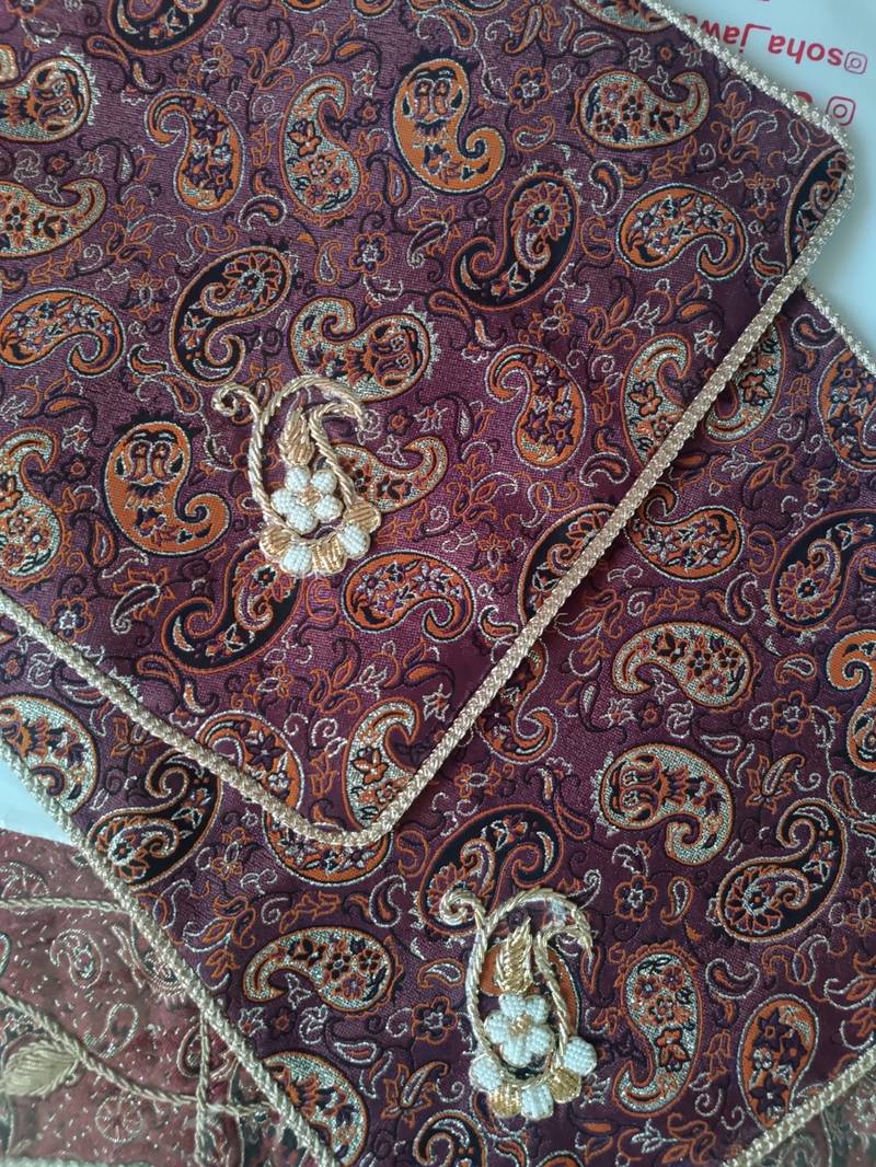 - جنس پارچه: معمولاً از مخمل، ترمه یا ساتن عسلی استفاده میشود که بافتی نرم و لوکس دارد و مناسب سرمهدوزی است.