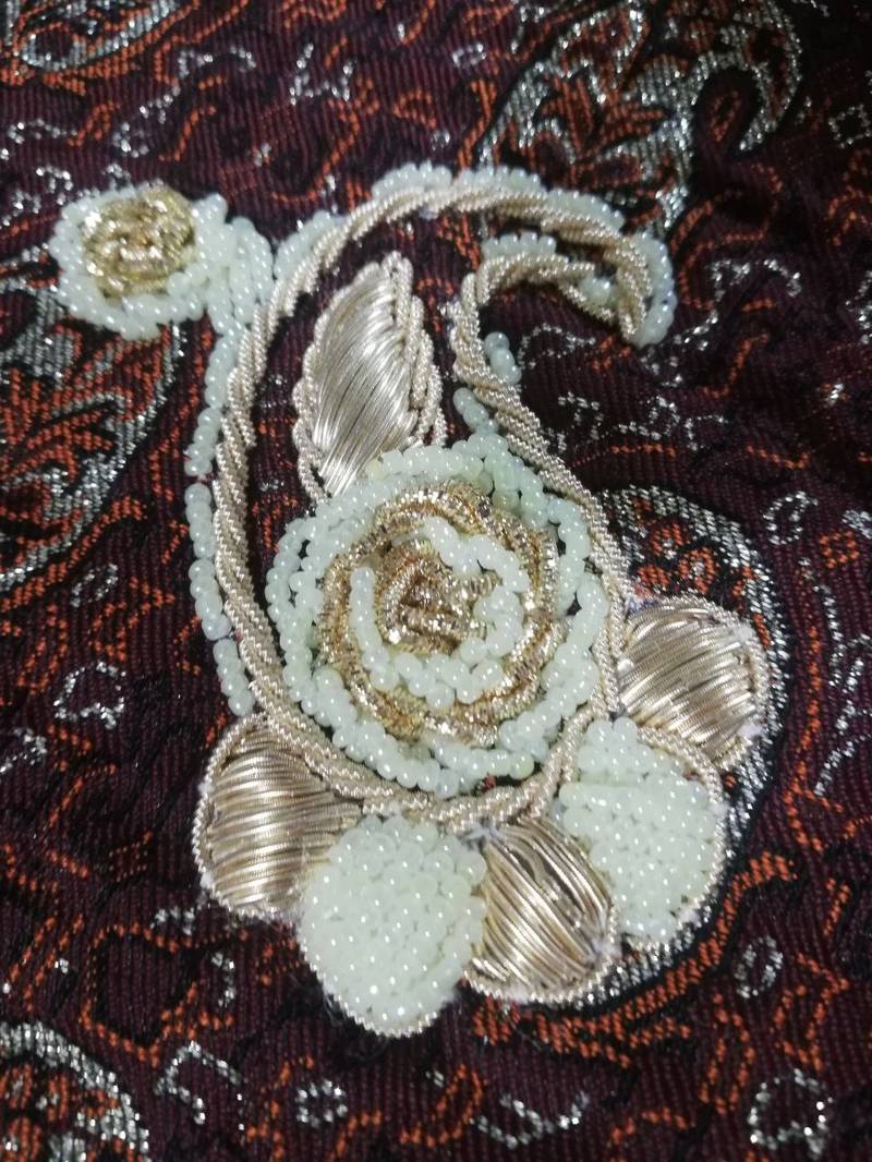 - سرمهدوزی: این هنر شامل دوخت ملیلههای فلزی، منجوق، پولک و نخهای براق روی پارچه است. معمولاً از ملیله ساده، ملیله تراش و منجوقهای طلایی یا نقرهای استفاده میشود.
