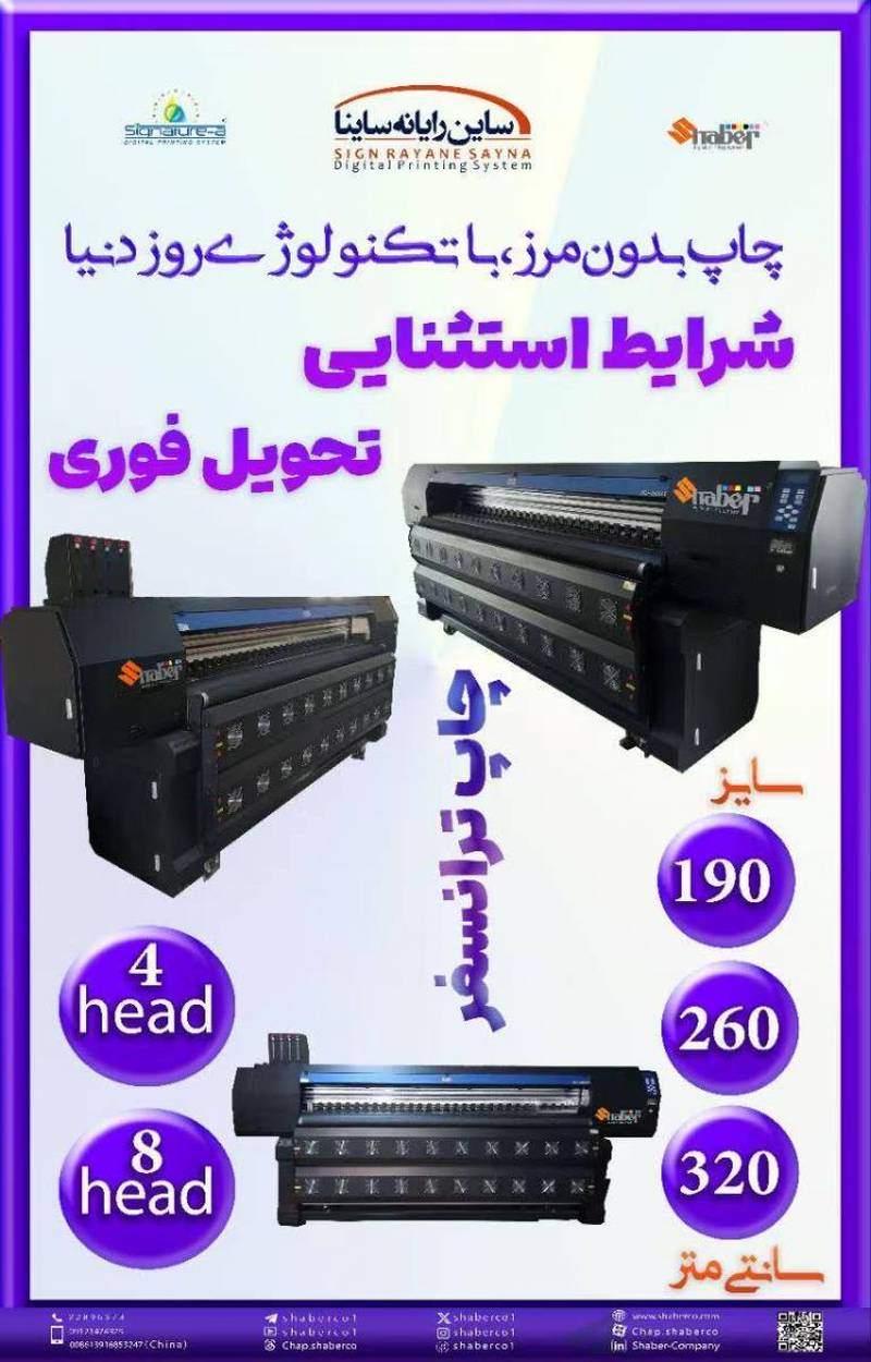 سایزهای متنوع: دستگاهها در سایزهای 190 سانتی متر و 320 سانتی متر موجود هستند، که به راحتی میتوانند نیازهای مختلف چاپ را پوشش دهند.