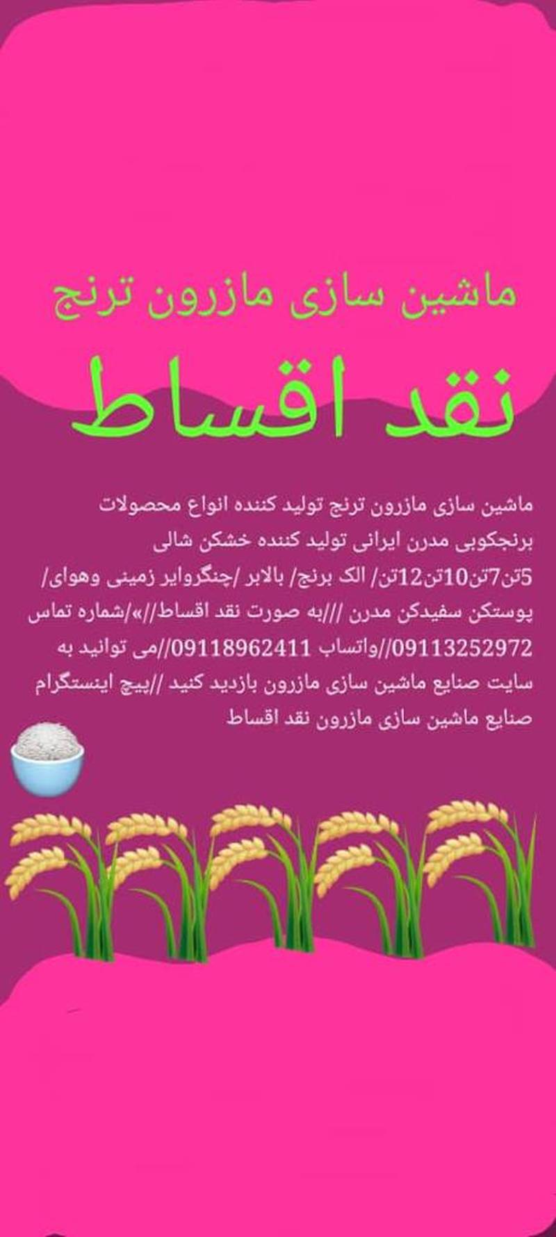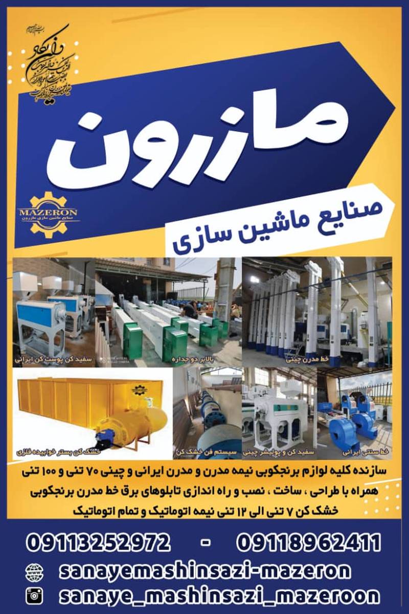 ماشین سازی مازرون ( ترنج) سازنده کلیه لوازم برنجکوبی سنتی، نمایندگی خط مدرن ایرانی و چینی در آمل می باشد.