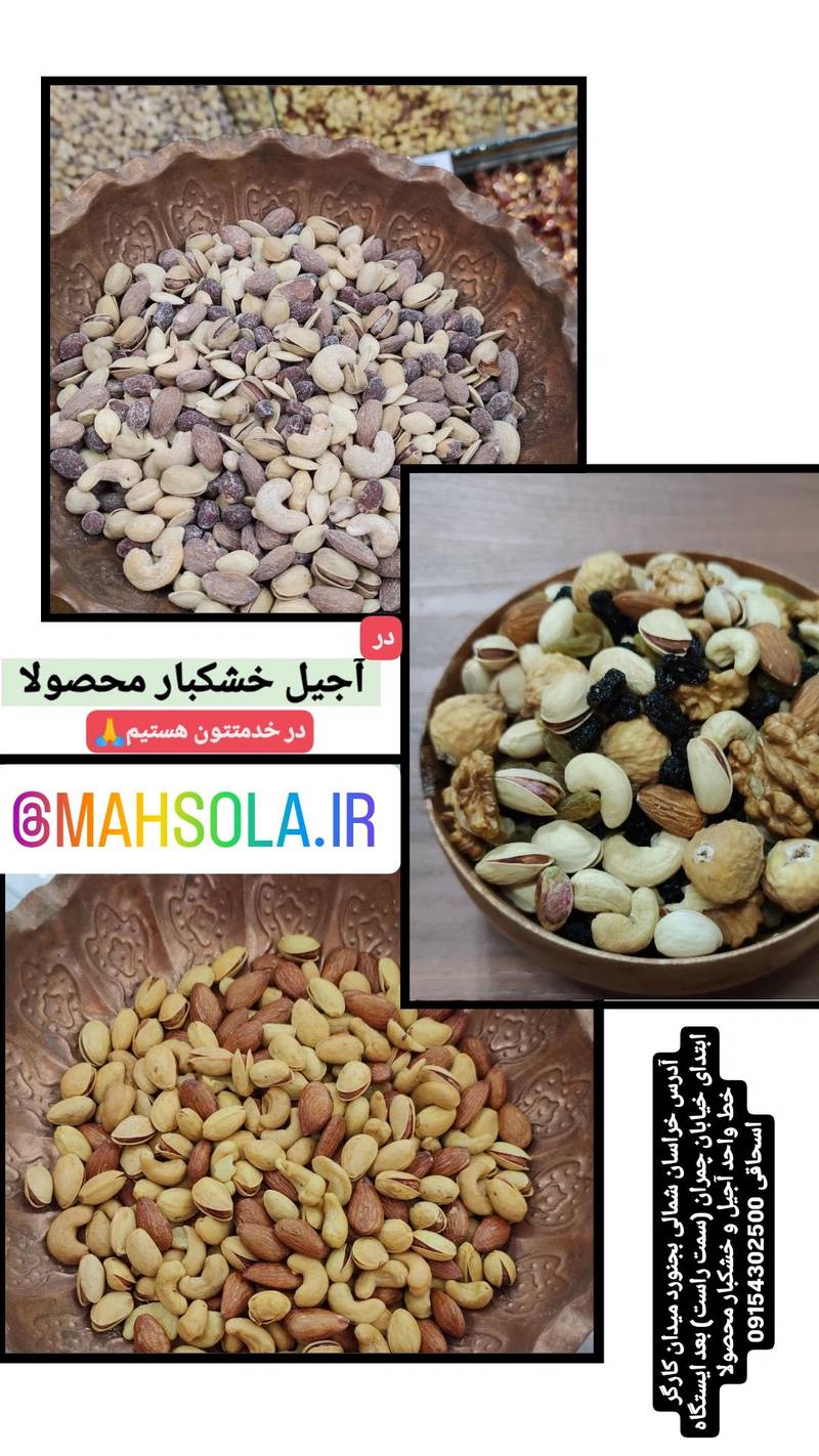 فروشگاه آجیل و خشکبار محصولا در بجنورد ارائهدهنده انواع آجیل و خشکبار تازه و باکیفیت به صورت مستقیم و بدون واسطه از کشاورزان و تولیدکنندگان. محصولات شامل گردو، مغز گردو، بادام، پسته، عسل، بادام هندی و سایر خشکبار است.