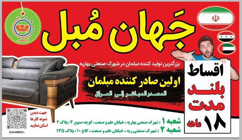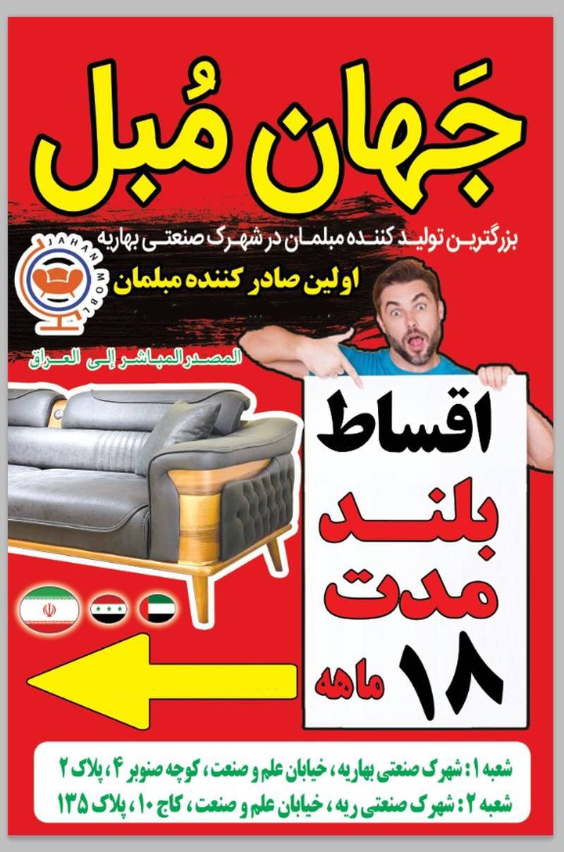 جهان مبل تهران _ فروش مستقیم انواع مبلمان راحتی، چستر، مکانیزه، تخت‌شو، ناهارخوری و جلو مبلی شرکت جهان مبل با بیش از یک دهه تجربه موفق در زمینه طراحی و تولید انواع مبلمان مدرن و کلاسیک، یکی از برندهای شناخته‌شده و معتبر در بازار مبلمان ایران و کشورهای عربی به‌شمار می‌رود. کارخانه‌ی جهان مبل در تهران واقع شده و با بهره‌گیری از ماشین‌آلات پیشرفته، متریال درجه‌یک و طراحی‌های روز دنیا، مجموعه‌ای کامل از مبلمان راحتی، مبل چستر لوکس، مبلمان مکانیزه و تخت‌خواب‌شو، سرویس ناهارخوری شیک، جلو مبلی و عسلی مدرن را ارائه می‌دهد. فروش ویژه و جشنواره بزرگ جهان مبل - اقساط بدون بهره تا 18 ماه جهان مبل با برگزاری جشنواره فروش اقساطی مبلمان بدون بهره و بدون پیش‌پرداخت، فرصت ویژه‌ای برای خرید آسان فراهم کرده است: فروش اقساطی 18 ماهه بدون بهره و بدون کارمزد بدون نیاز به پیش‌پرداخت فقط با ارائه چک صیادی ۲ماه به ۲ ماه خرید به‌صورت حضوری و غیرحضوری از طریق سایت از کارخانه (فروش مستقیم) تحویل سریع مبلمان به سراسر ایران و کشورهای عربی چرا جهان مبل را انتخاب کنید؟ تولید و پخش مستقیم از کارخانه بیش از ۷۰ نمایندگی فعال در سراسر ایران و خارج از کشور تنوع بسیار بالا در طرح، رنگ و جنس پارچه قیمت مناسب و رقابتی نسبت به بازار طراحی ارگونومیک و راحتی بالا امکان انتخاب مدل سفارشی مطابق با دکوراسیون منزل شما ارسال مبلمان به سراسر ایران: تهران، شیراز، مشهد، اصفهان، اهواز، تبریز، بندرعباس و… صادرات مبلمان به کشورهای عربی مانند عراق، کویت، عمان، قطر، امارات و… خرید بدون واسطه مستقیم از تولیدی با نازلترین قیمت در سطح کشور
