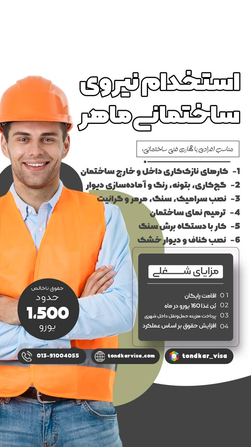 درباره ما : 🔹کاریابی بین الملی تندکار موسسه کاریابی بین المللی تندکار با مجوز رسمی وزارت کار از سال ۱۳۹۷ با مدیریت خانم دکتر تندکار، شروع به کار نموده است. 🔹این موسسه از سال ۱۳۹۵ تاکنون مجوزهای کاریابی داخلی، مرکز مشاوره و خدمات کارآفرینی، کاریابی مجازی و در ادامه مجوز مرکز شتابدهی را اخذ نموده است. 🔹فعالیت های موسسه کاریابی بین‌المللی تندکار در زمینه اخذ ویزا و‌ مهاجرت کاری، تحصیلی و سرمایه گذاری در کشورهای کانادا، استرالیا و کشورهای اروپایی از جمله پرتغال، دانمارک، سوئد، ایتالیا، آلمان، اتریش، مجارستان، رومانی، لهستان و… همچنین کشورهای روسیه، چین، قبرس و ترکیه می باشد. 🔹در سال 2022 شرکت مشاوره تندکار با عنوان TONDKAR CONSUTING AGENCY در کشور رومانی ثبت شد و بعنوان اولین موسسه کاریابی بین المللی دارای مجوز در ایران و رومانی در زمینه های کار، تحصیل و سرمایه گذاری فعال میباشد. 🔹موسسه کاریابی بین المللی تندکار با نام تجاری تندکار ویزا با همراهی وکلای مجرب در کشورهای مختلف و نیز تیم های مستقر در این کشورها، خدمات شایسته ای به متقاضیان مهاجرت ارائه می نماید.