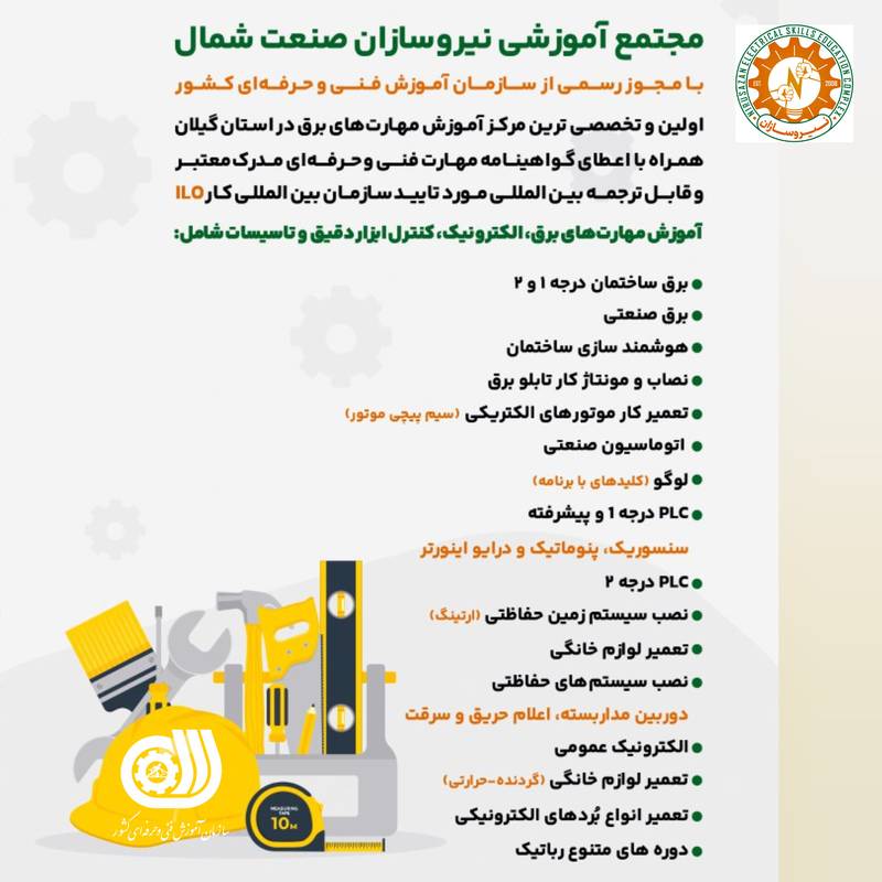 آموزشگاه فنی و حرفهای نیروسازان صنعت شمال اولین و تخصصی ترین مرکز آموزش مهارتهای برق در استان گیلان شهرستان رشت با مجوز رسمی از سازمان آموزش فنی و حرفهای کشور در زمینه های برق و الکترونیک و تاسیسات و کنترل ابزار دقیق