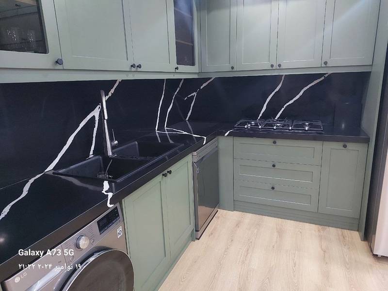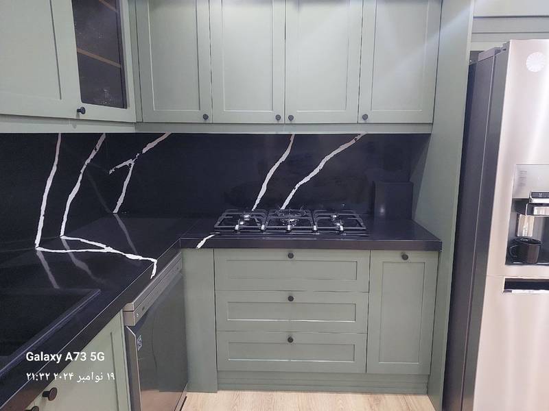 ویژگیهای برجسته اجرای صفحه کابینت و بین کابینتی کوارتز برند توتم رگه دار: