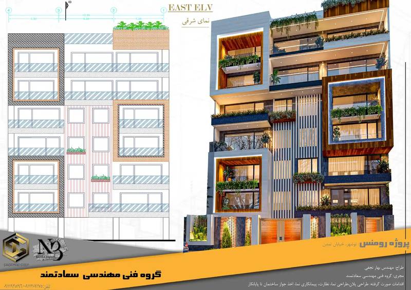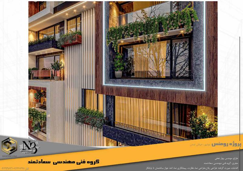 آپارتمان مسکونی رومنس ساختمان ۶ طبقه روی پیلوت تعداد ۱۰ واحد با پارکینگ مورد تایید شهرداری) مساحت واحدها ۱۵۲ و ۱۲۷ و ۲۸۱ متر مربع سقف پروژ روف گاردن بام تخت نما مدرن با متریال سنگ ترموود، آجرنما جانمایی مرکز شهر با فاصله ۶۰۰ متری از ساحل دید مناسب شهری لوازم مصرفی به روز با استاندارد ایران