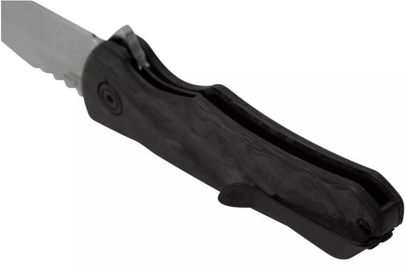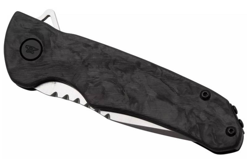 2. دسته فیبر کربن: دسته این چاقو از فیبر کربن با کیفیت بالا ساخته شده که علاوه بر وزن سبک، استحکام فوق العاده ای دارد. طراحی ارگونومیک دسته به کاربر اجازه می دهد چاقو را در دست بگیرد بدون اینکه احساس خستگی کند.