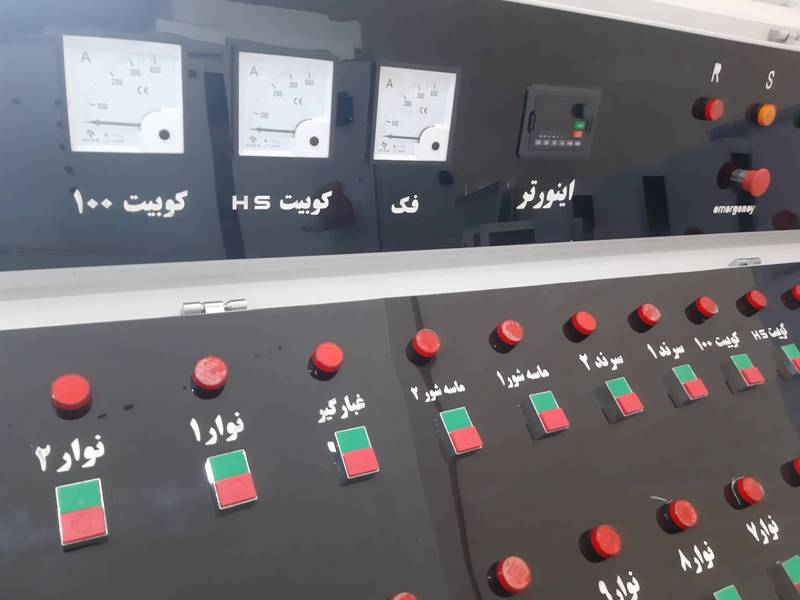 - تابلو برق: **پیانویی، دارای بار کنترل فاز، کلید اصلی، کلید اضطراری، کنتاکتورها و سایر ادوات برقی**