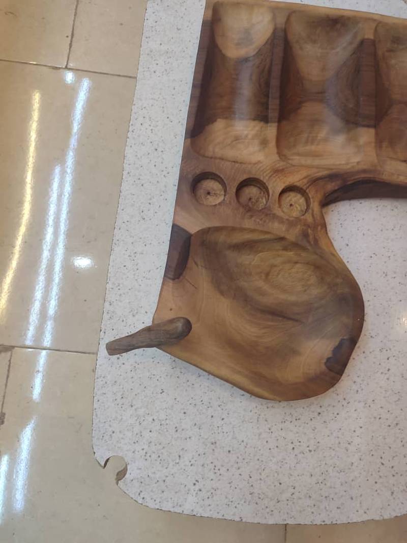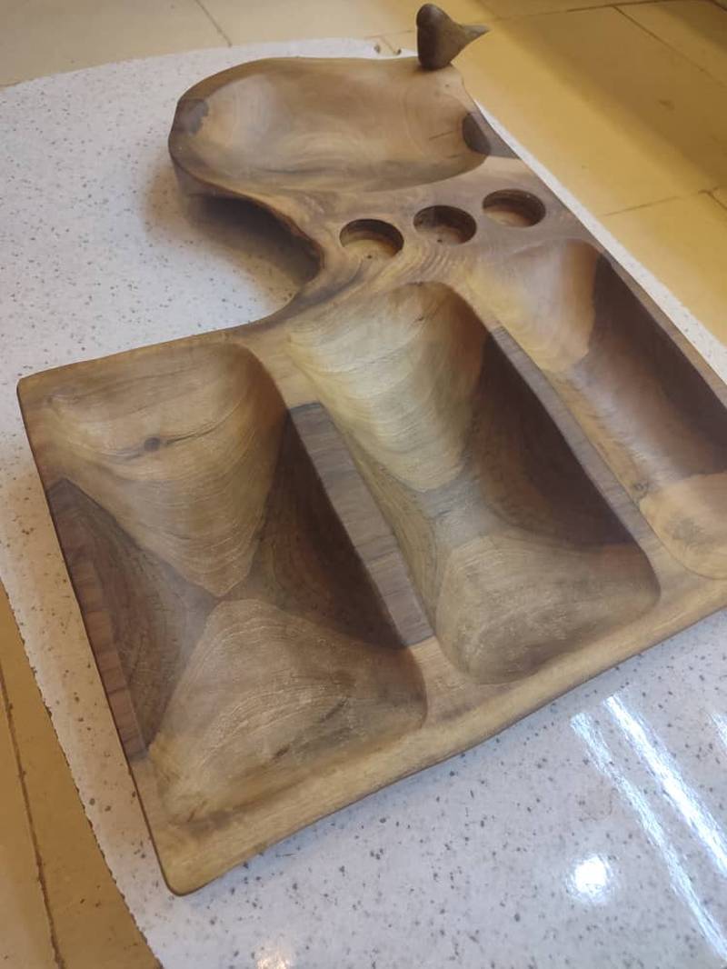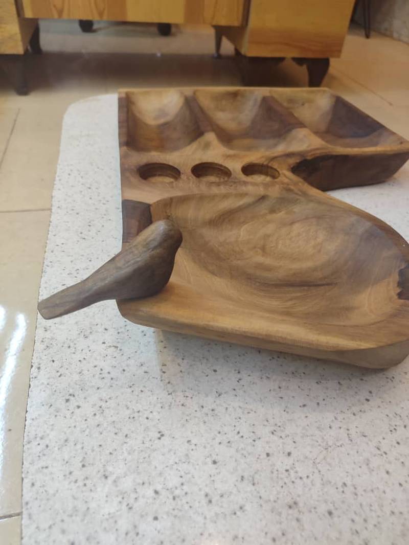اردوخوری دست تراش دفرمه چوب گردو دارای جا وارمری و پرنده چوبی