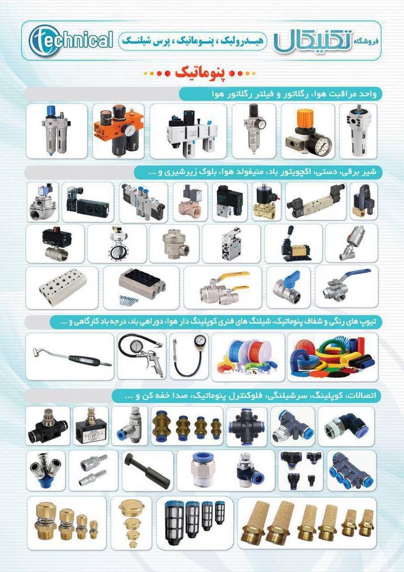 تجهیزات پنوماتیک شامل انواع شیلنگ تیوب) شیر آلات پنوماتیک اتصالات واحد مراقبت ، رگلاتور ، فیلتر و ..... اتصالات و لوله های هیدرولیک کاتر پیلار ، بیل مکانیکی ، لیفتراک)