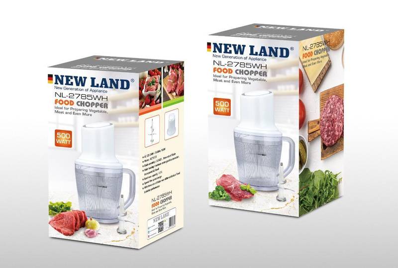 روی بستهبندی تصاویری از مواد غذایی مختلف مانند گوشت، سبزیجات و گوشت چرخکرده نشان داده شده است که نشاندهنده کارایی این دستگاه در خرد کردن و تهیه این مواد است.