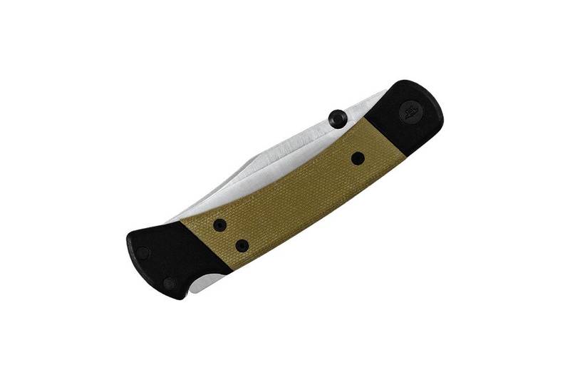 دسته از آلومینیوم آنودایز خاکستری با منبت کاری از بوم سبز O. D. میکارتا که در برابر سایش مقاوم است ساخته شده است. در این سری از چاقوهای باک به جای فلز برنجی و زرد رنگ از فلز آلومینیوم که وزن سبکی دارد استفاده شده است.