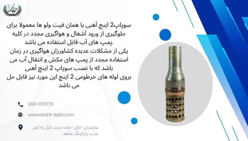 سوپاپ 2 اینچ آهنی یا همان فیت ولو ها معمولا برای جلوگیری از ورود آشغال و هواگیری مجدد در کلیه پمپ های آب قابل استفاده می باشد یکی از مشکلات عدیده کشاورزان هواگیری در زمان استفاده مجدد از پمپهای مکش و انتقال آب می باشد که با نصب سوپاپ 2 اینچ آهنی