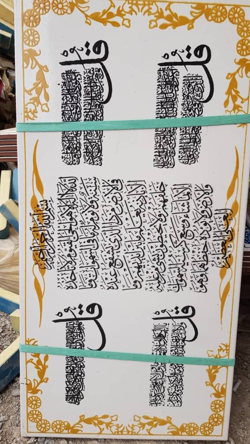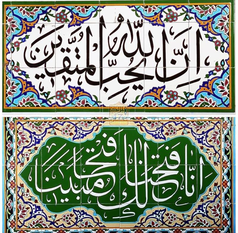 طراحی و اجرای انواع تابلوهای قرآنی شامل وانیکاد، چهارقل و دیگر آیات شریفه، با کاشیکاری اصیل و کیفیت بالا.