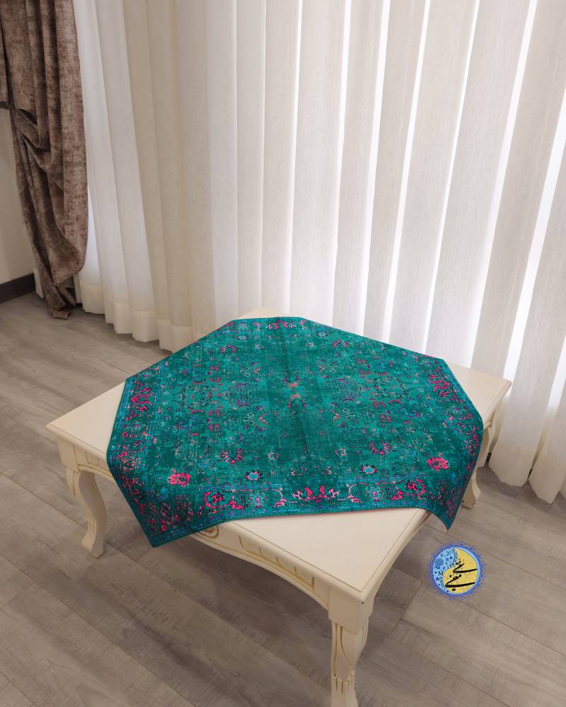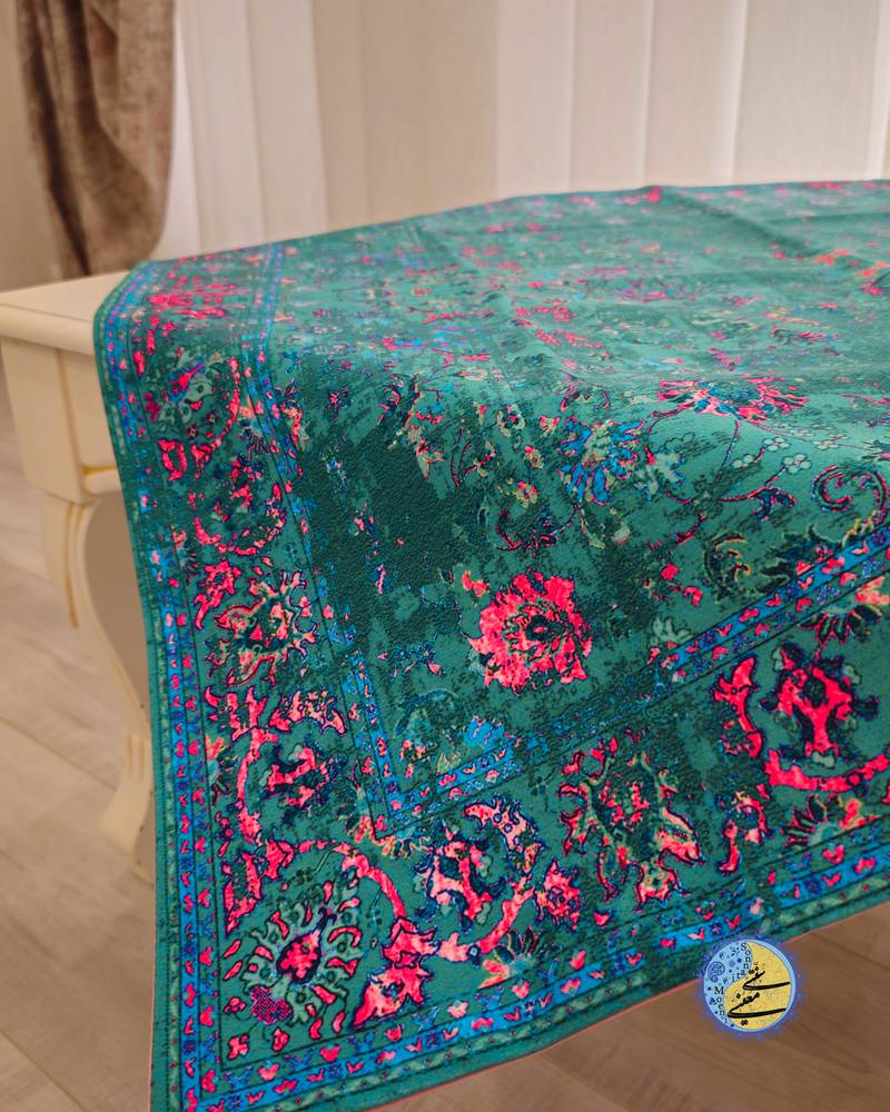 رومیزی مخمل کوب سبز با گلای صورتی قابل شستشو