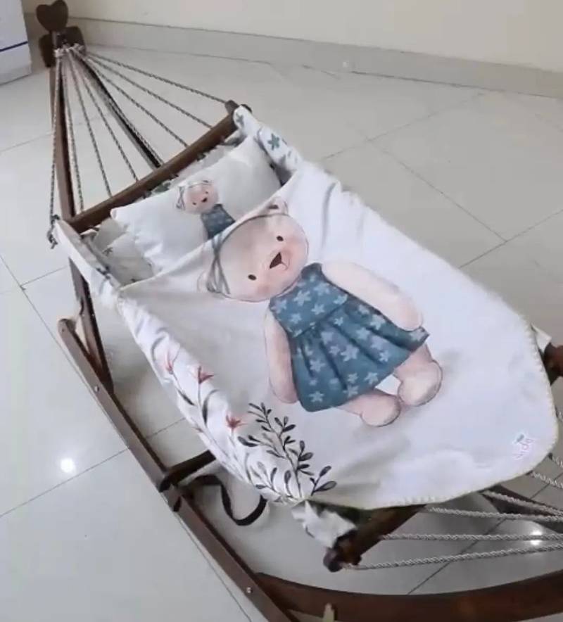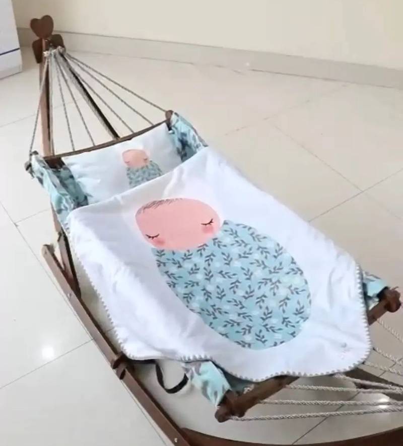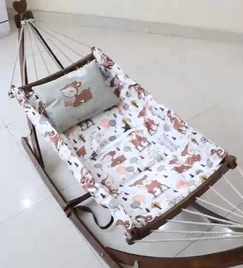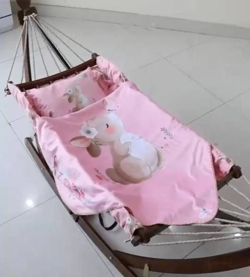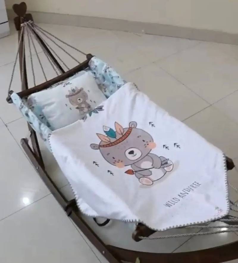 گهواره ننو سنتی چوبی با تشک سایز بزرگ از جنس مخمل به همراه یک بالش ست با تشک.