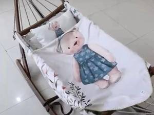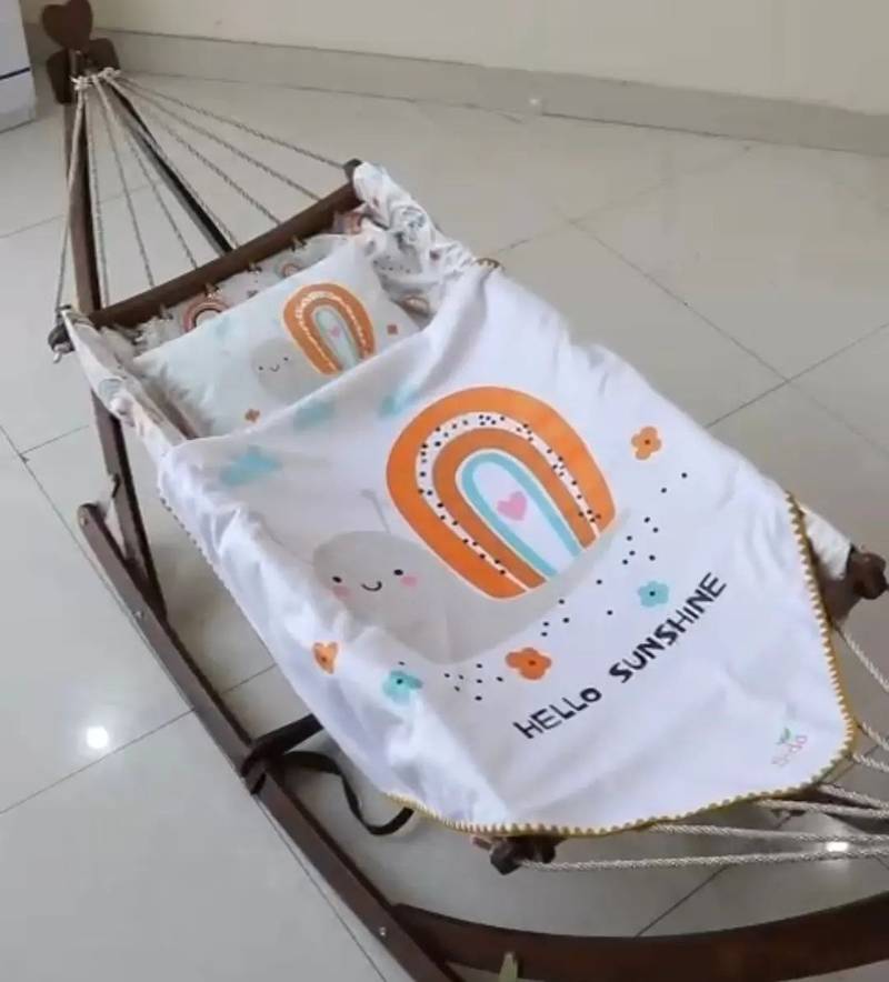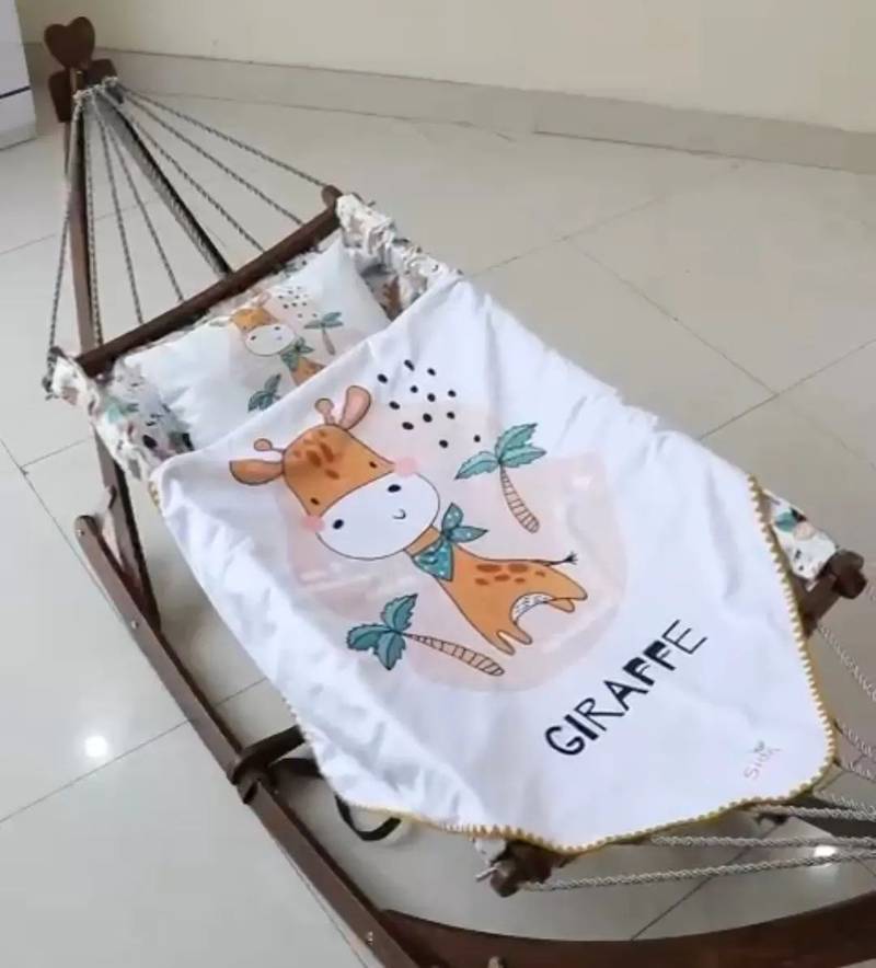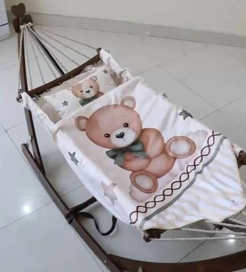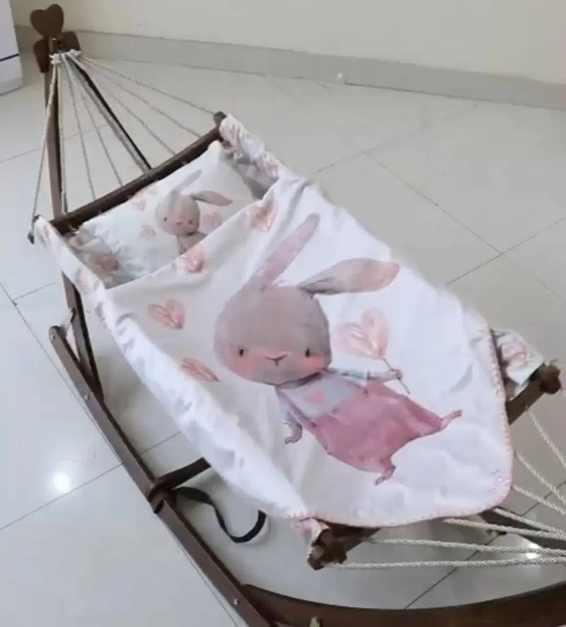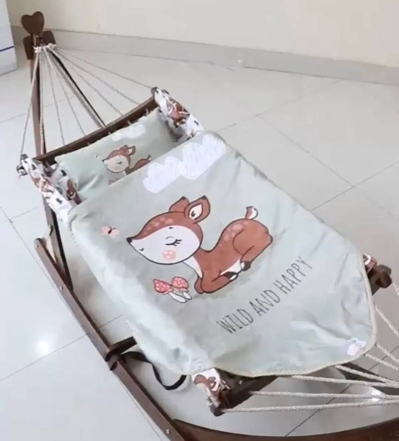 گهواره ننو سنتی چوبی با تشک سایز بزرگ از جنس مخمل به همراه یک بالش ست با تشک.