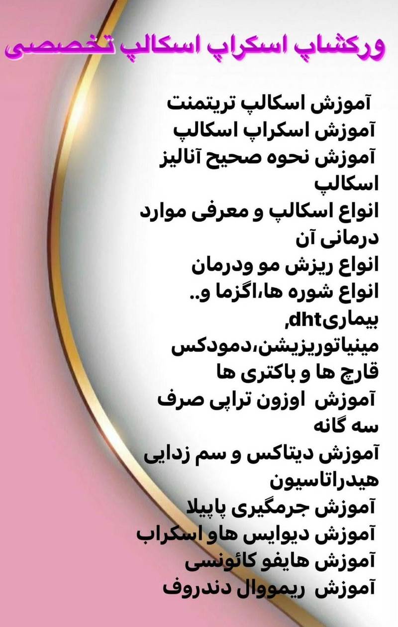 ورکشاپ اسکراب اسکالب تخصصی آموزش اسکالپ تریتمنت آموزش اسکراپ اسکالپ آموزش نحوه صحیح آنالیز اسکالپ انواع اسکالپ و معرفی موارد درمانی آن انواع ریزش مو و درمان انواع شوره ها اگزما ... بیماری dht مینیاتوریزیشن دمودکس قارچ ها و باکتری ها آموزش اوزون تراپی صرف سه گانه آموزش دیتاکس و سم زدایی هیدرا تاسیون آموزش جرمگیری پاپیلا آموزش دیوایس ها و اسکراب آموزش هایفو کائونسی آموزش ریمووال دندروف