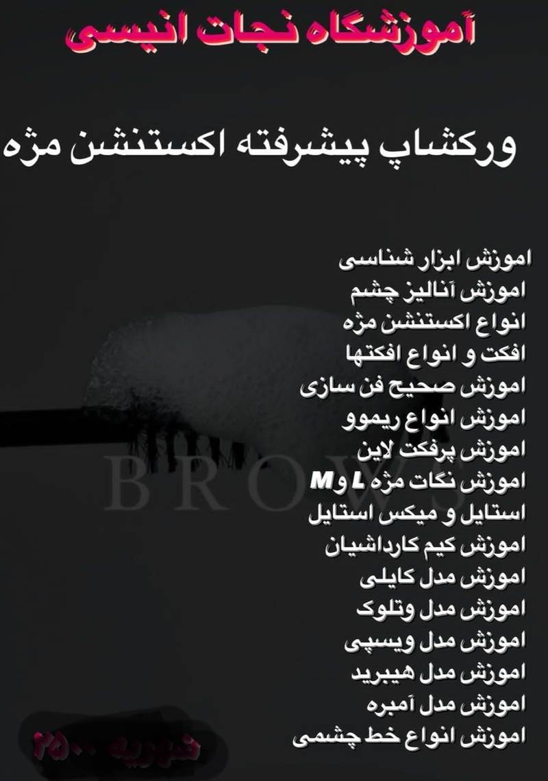 ورکشاپ پیشرفته اکستنشن مژه آموزش ابزار شناسی آموزش آنالیز چشم انواع اکستنشن مژه افکت و انواع افكتها اموزش صحیح فن سازی آموزش انواع ريموو آموزش پرفکت لاین آموزش نگات مژه M L BRC استایل و میکس استایل آموزش کیم کارداشیان آموزش مدل کایلی اموزش مدل وتلوک آموزش مدل ویسپی آموزش مدل هیبرید آموزش مدل آمبره اموزش انواع خط چشمی