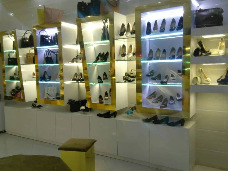 نمونه ای از کار دکور کیف و کفش که در این کار از هایگلاس سفید و طلایی استفاده شده.