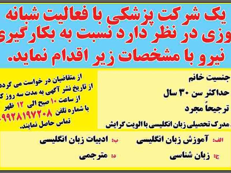 یک شرکت پزشکی با فعالیت شبانه روزی در نظر دارد نسبت به بکارگیری نیرو با مشخصات زیر اقدام نماید.