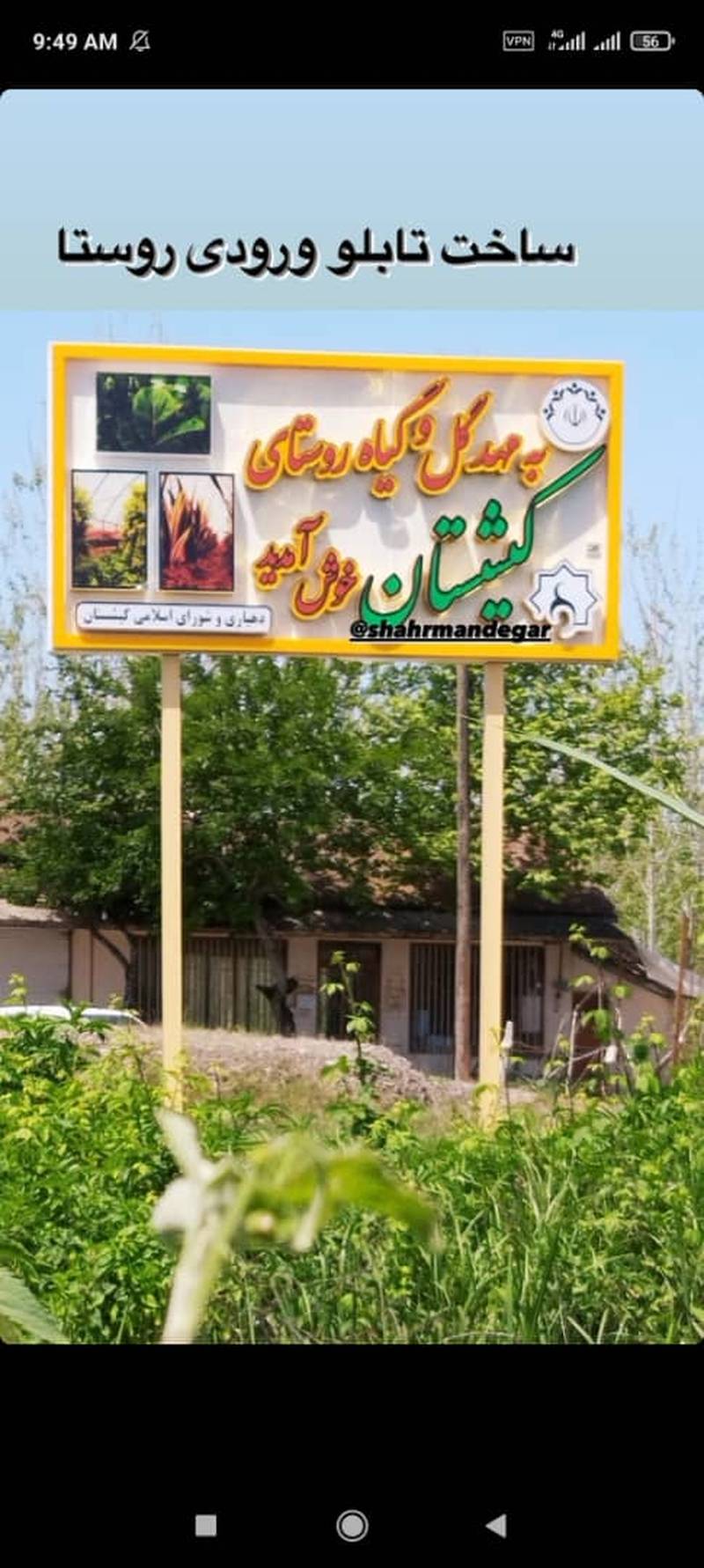 تابلو ورودی روستا : روکش کامپوزیت ، نوشتار چلنیوم ، ابعاد ۱.۲۵×۳ متر ، ارتفاع ۵ متر.