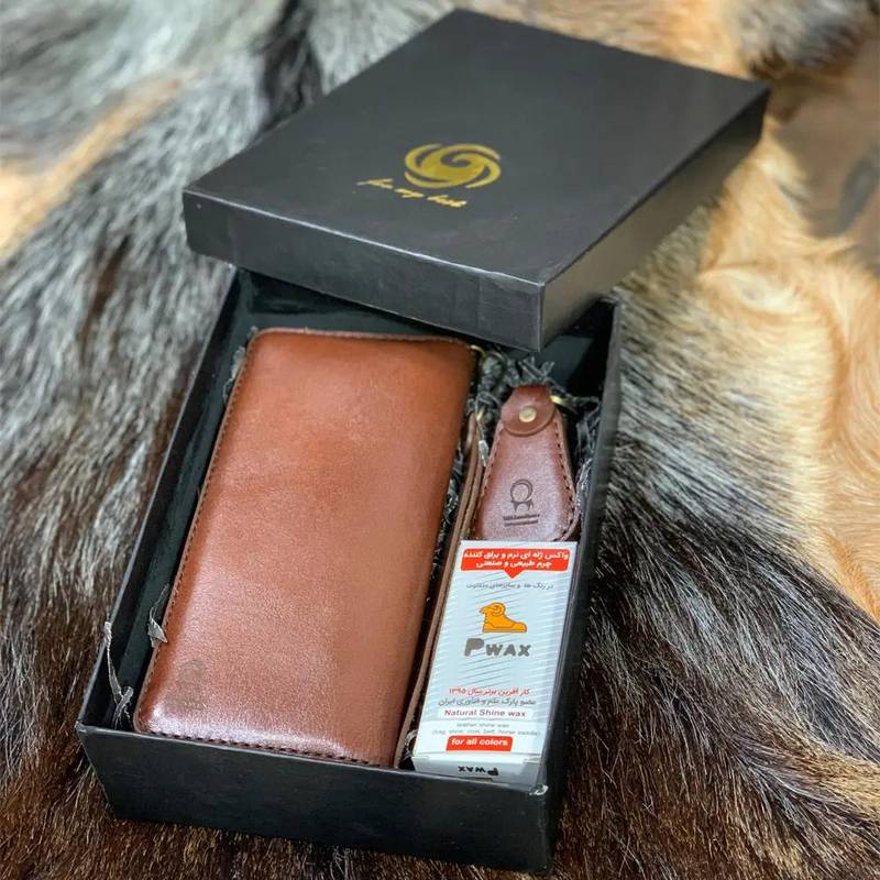 باکس ست چرم طبیعی مردونه با چرم قهوهای فندقی گاوی، کاملاً دستدوز 🪡 و قابل اجرا با رنگ دلخواه شما. این ست شامل کیف پول تمام چرم، جاسوئیچی چرم و پی واکس مخصوص چرم میباشد.