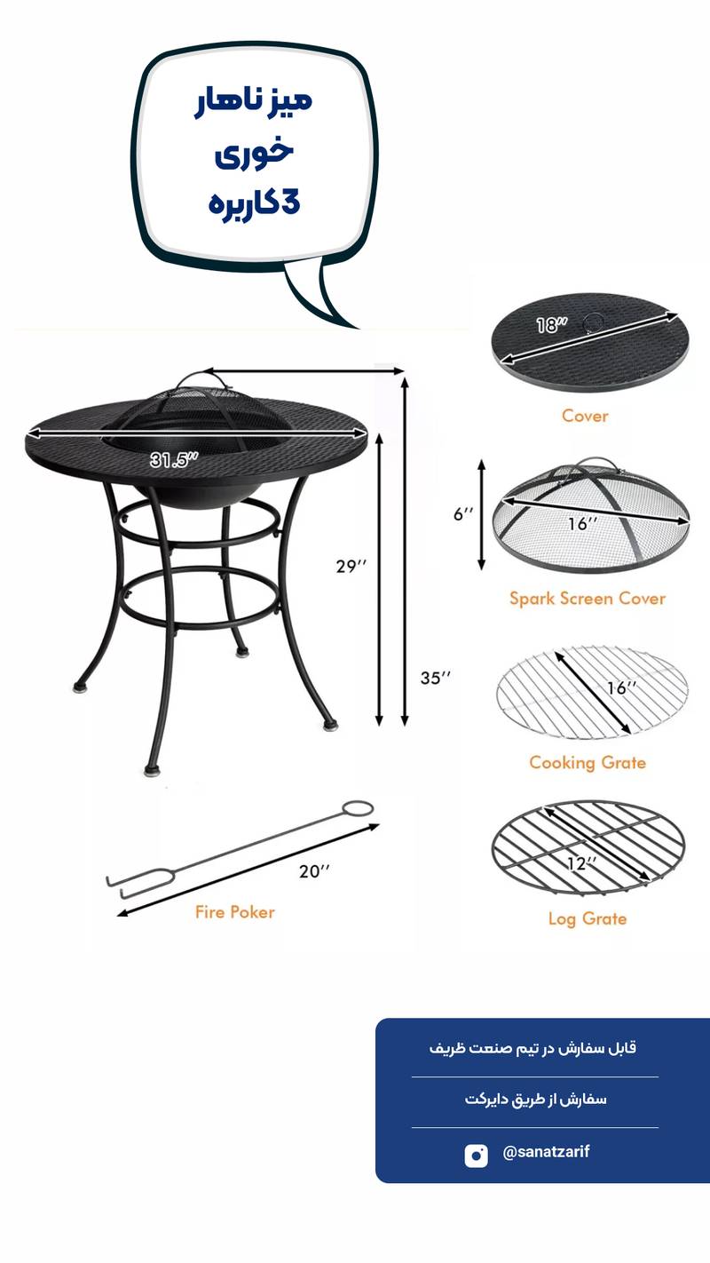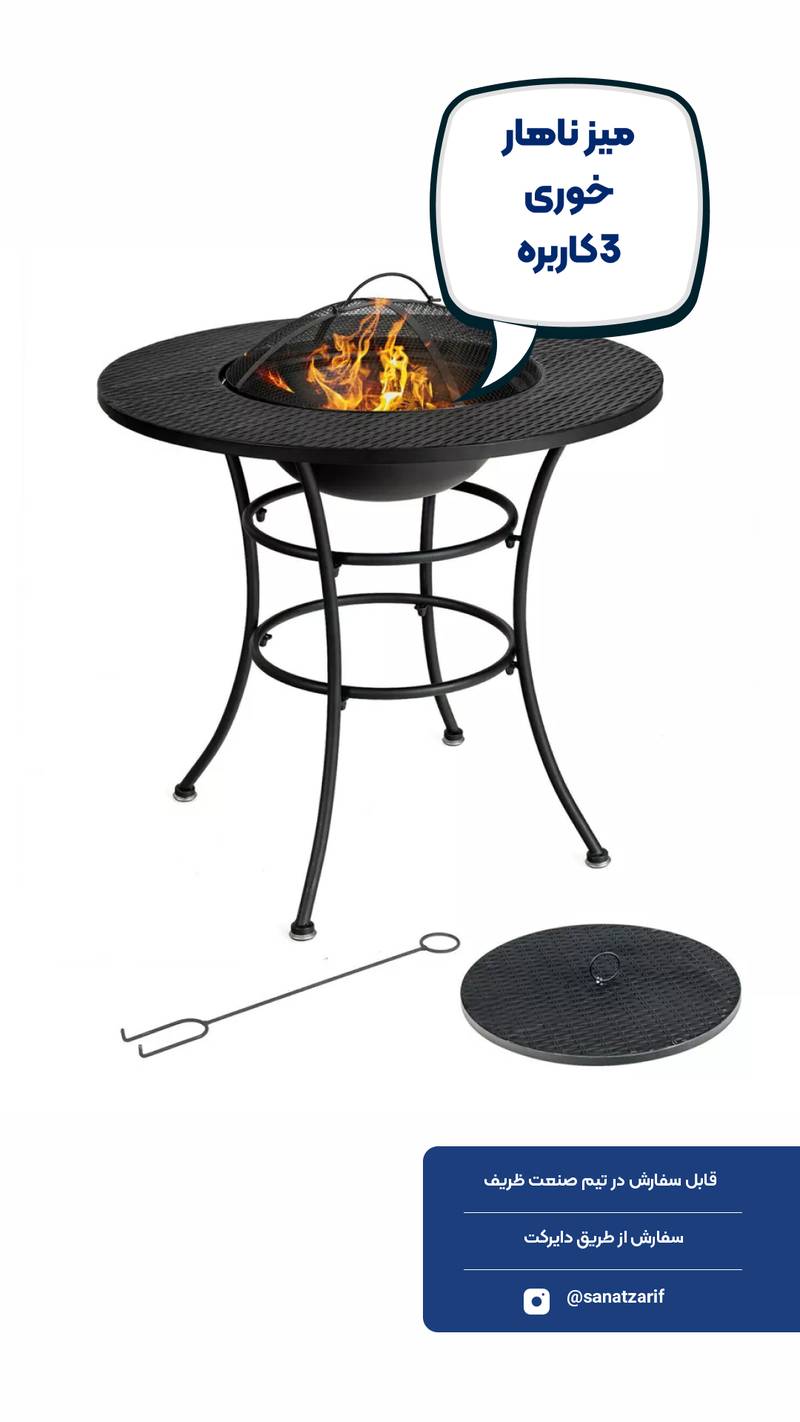 میز ناهارخوری سهکاره؛ ترکیبی از میز، آتشدان و جای کبابی! طراحی منحصربهفرد برای دورهمیهای گرم و صمیمی. ساخته شده از متریال مقاوم و باکیفیت، مناسب فضای باز و حیاط. خرید مستقیم از تولیدکننده.