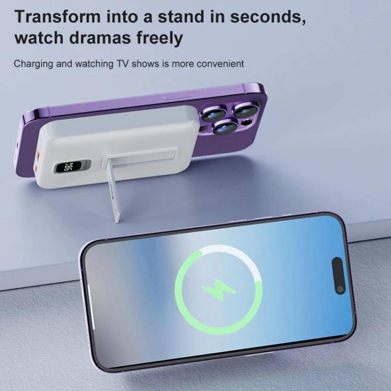 ویژگی منحصر به فرد این پاوربانک، طراحی هوشمندانه آن است که شامل یک پایه مگنتی یکپارچه میشود. این پایه شما را قادر میسازد تا از پاوربانک به عنوان نگهدارنده گوشی استفاده کنید و به راحتی ویدیو تماشا کنید یا در تماسهای ویدیویی شرکت نمایید، در حالی که دستگاه شما همزمان در حال شارژ است.