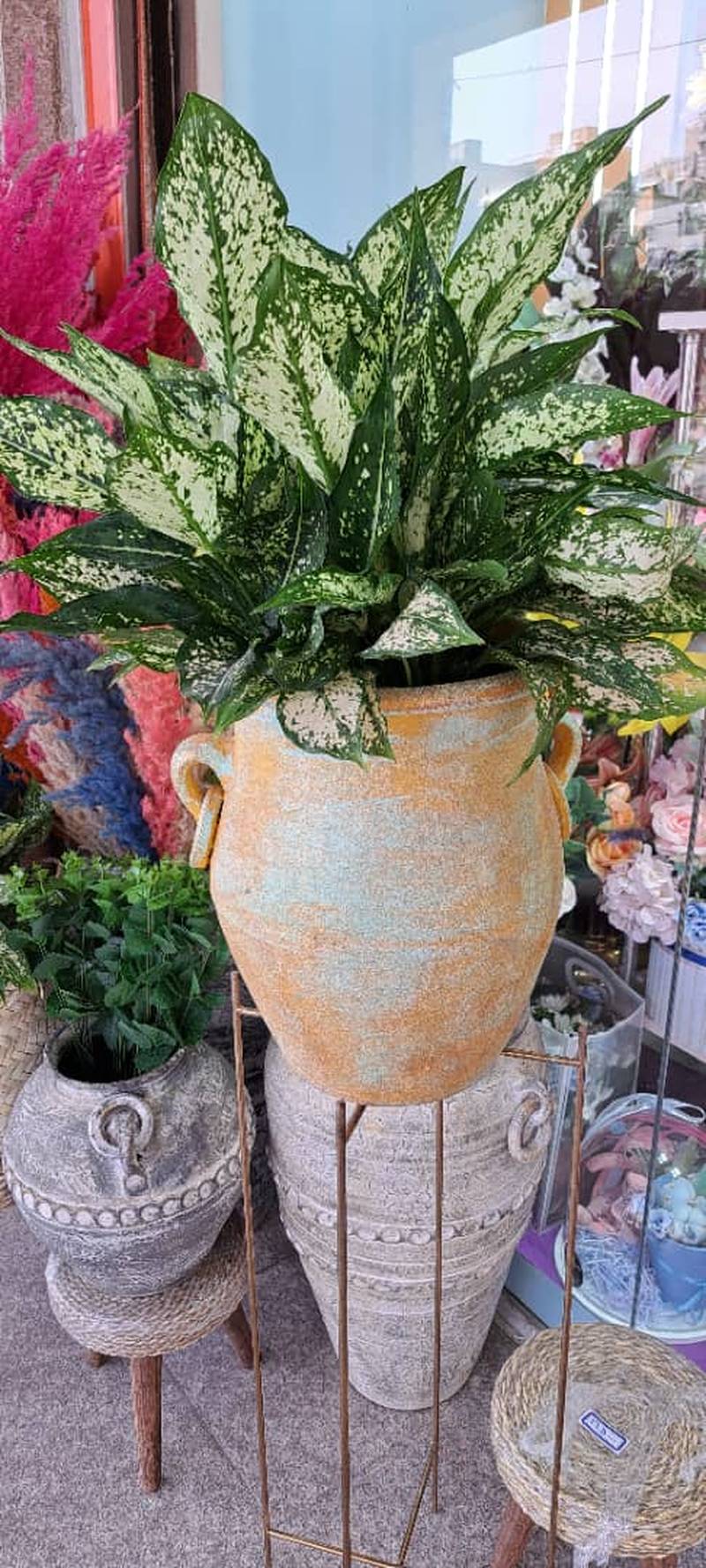 این آگلونما برفی با گلدان پتینه ای شیک، ترکیبی از طراوت و شادابی را به فضای شما می آورد. برگ های ابلق و سفید رنگ آن، همراه با مقاومت بالا، انتخاب مناسبی برای نگهداری در محیط های آپارتمانی است.