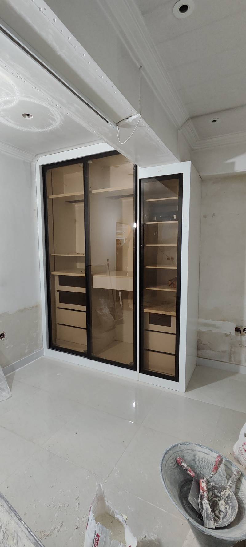 کابینت مدرن با متریال های گلاس سفید و کم کمد دیواری باکسی با دربهای ریلی شیشه ای به همراه لاین نوری