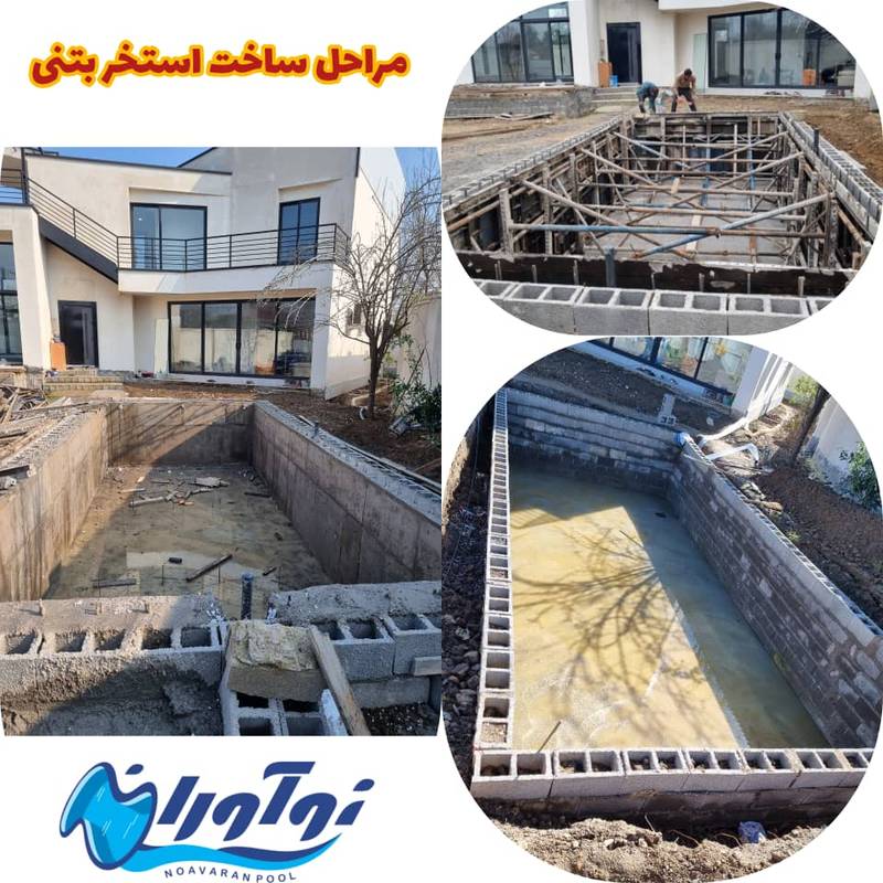 2. **اجرای سازه**: پس از آمادهسازی زمین، قالببندی و بتنریزی با دقت انجام میشود تا استخری مستحکم ایجاد شود.