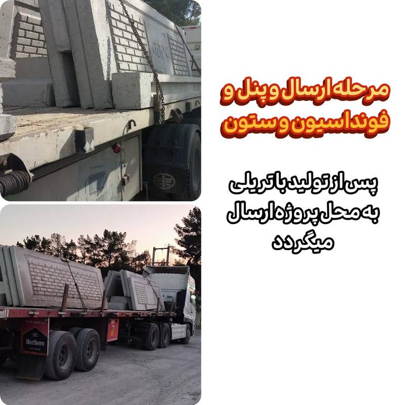 پس از خشک شدن کامل، پنل ها، ستونها و فونداسیون ها با تریلیهای مجهز به محل پروژه ارسال می شوند.