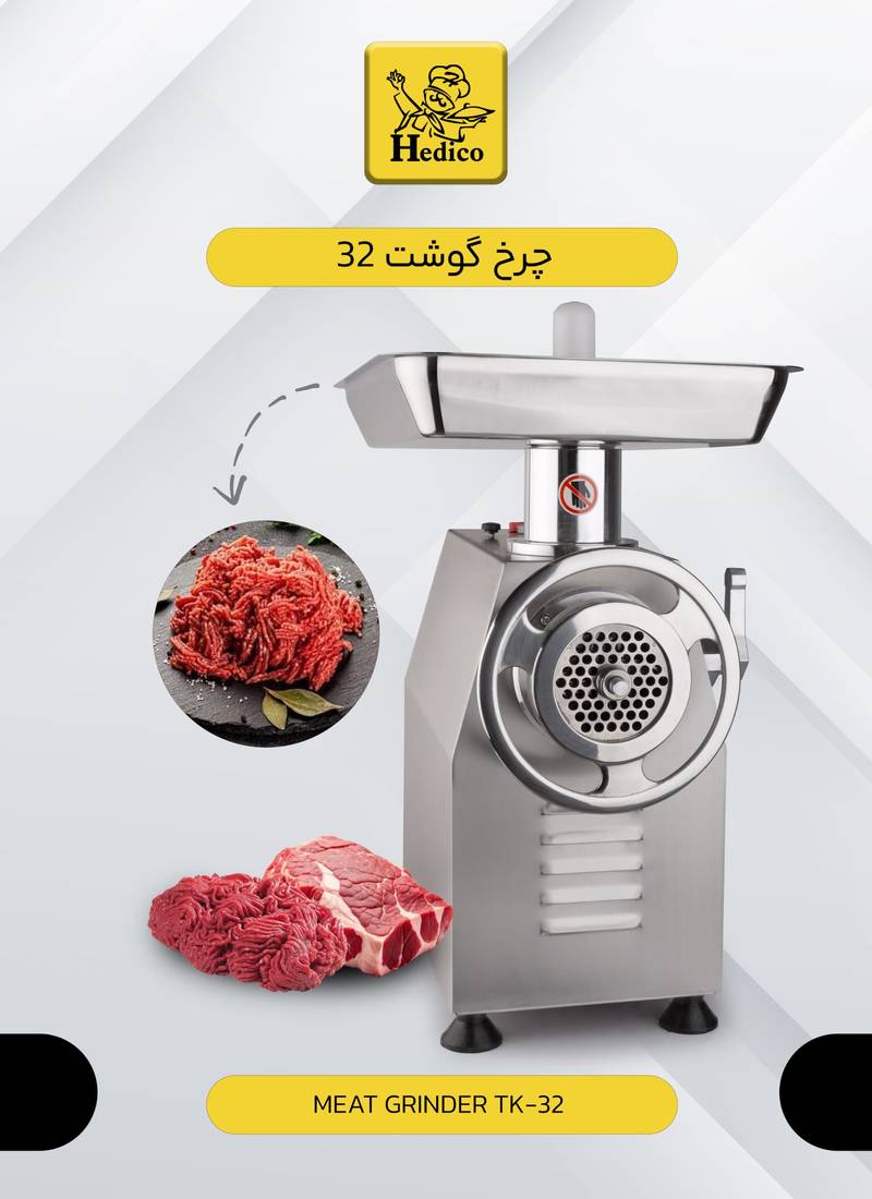 چرخ گوشت گیربگسی ۳۲ وارداتی فول استیل ۳۰۴ نگیر با تیغ پنجره استیل و یدک دارای گلوی و مارون و طوقه استیل گلوی متحرک دارای سینی جلو با موتر ۲ اسب دارای دور برعکس باضمامت یک ساله مناسب رستوران ، فست فود، قصابی ، تالارها و غیر